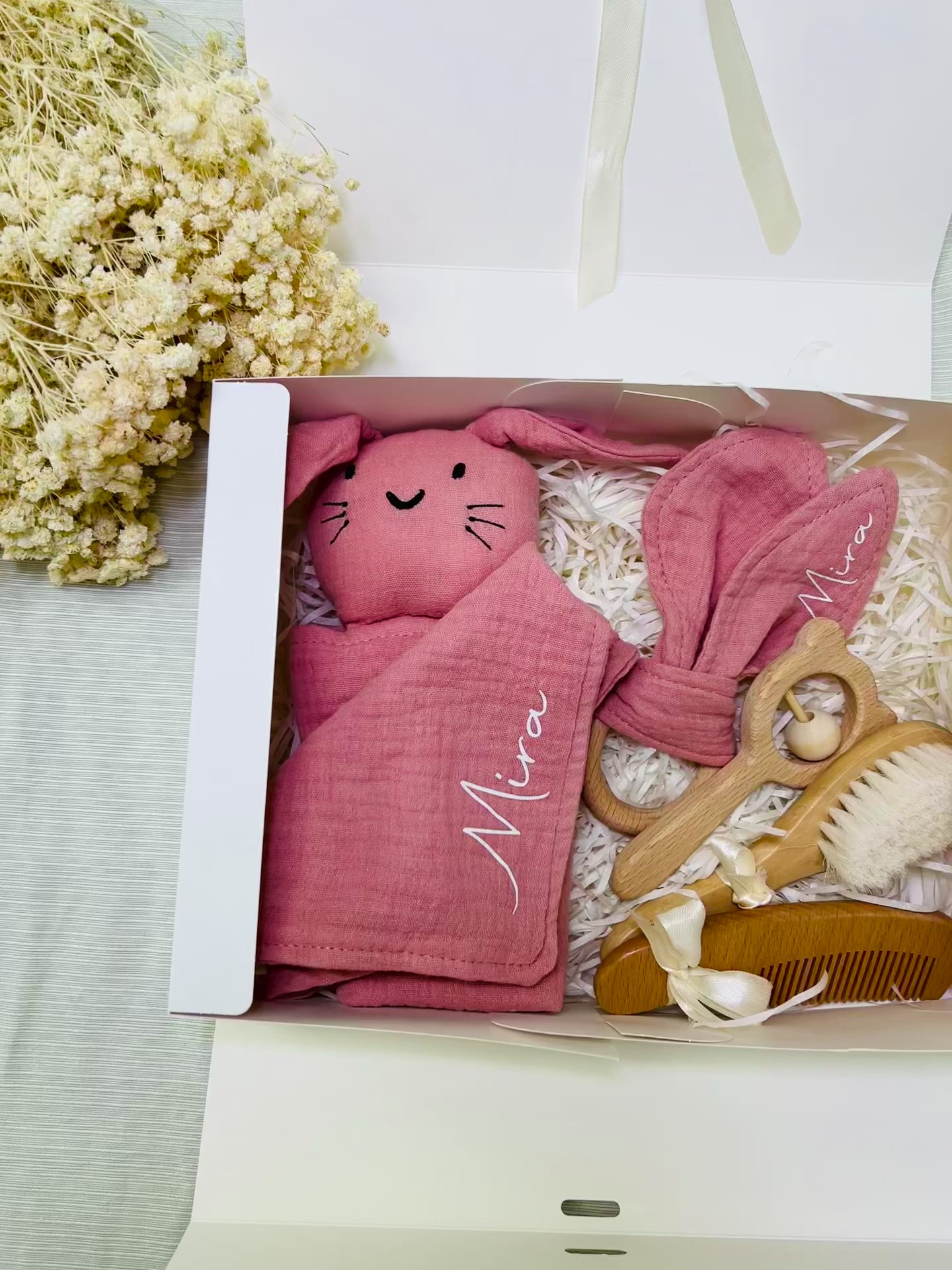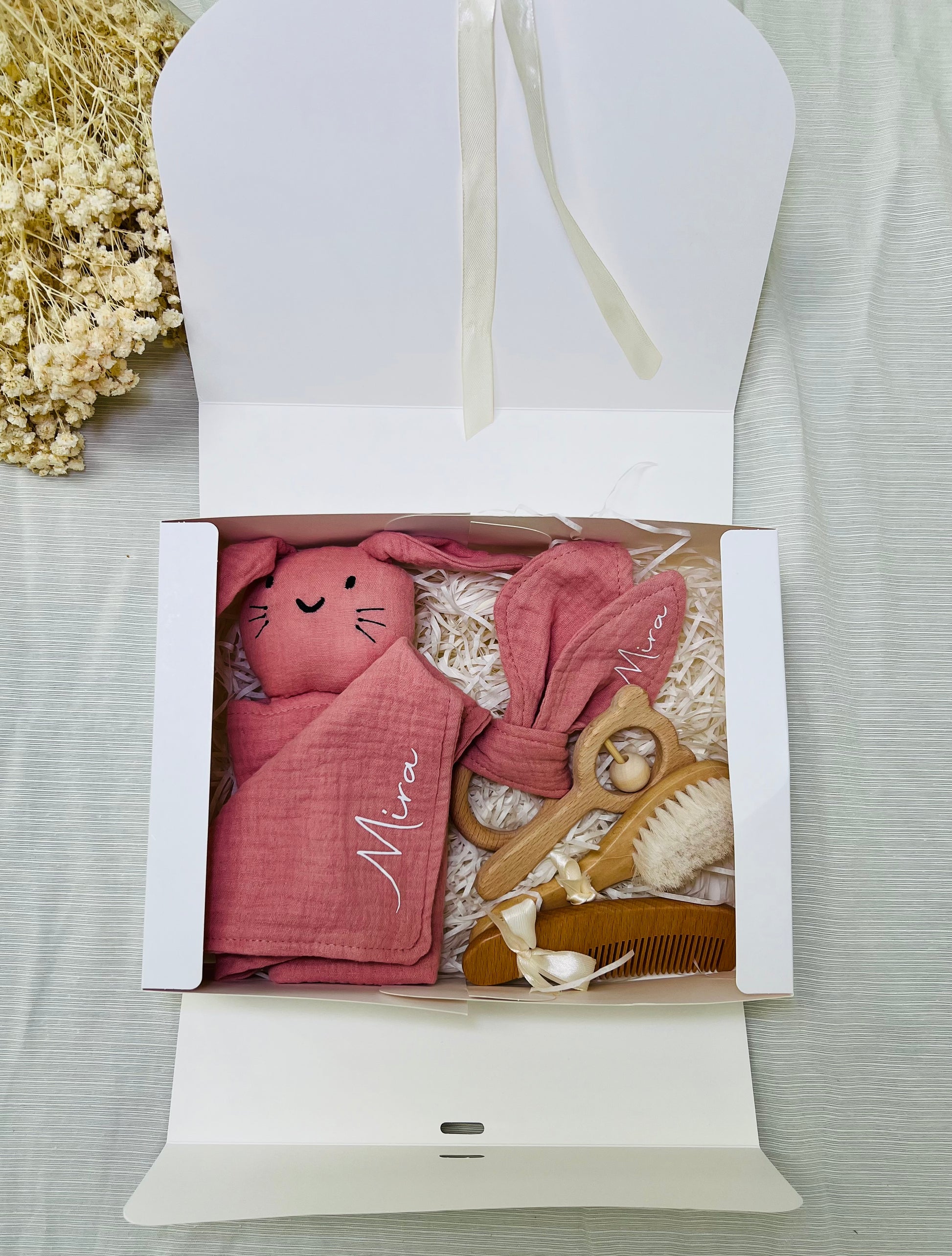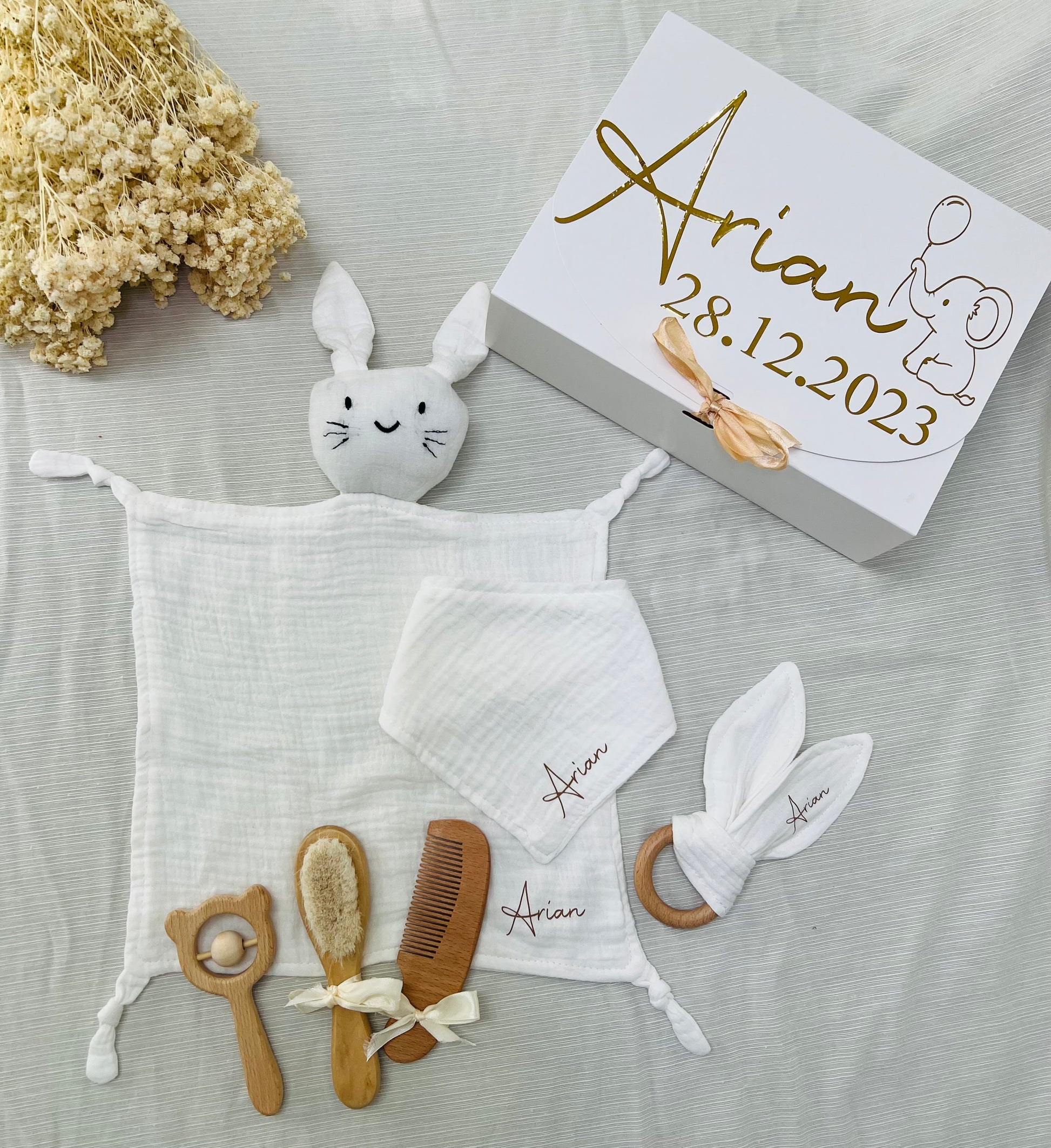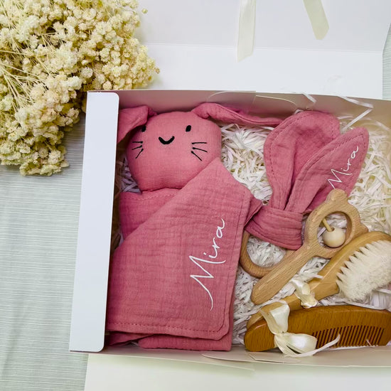 Entdecke personalisierten Geschenke zur Geburt : Schnüffel Tuch, Lätzchen, Holzring, Haar Bürste, Kamm und Baby Rassel Geschenkbox und personalisierte Willkommenskarte für kleine Entdecker. Farbenfroh, sicher und individuell !